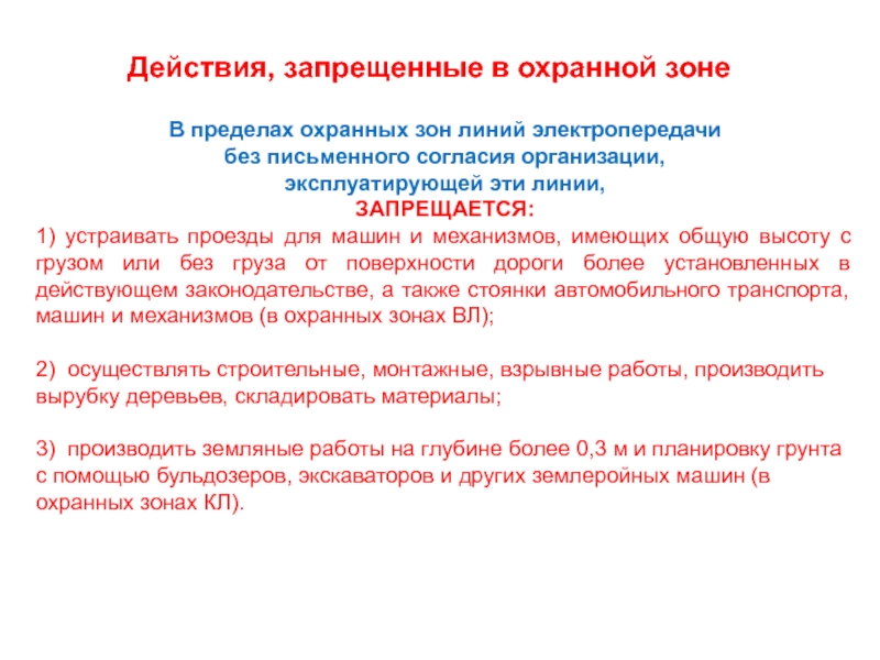 1) устраивать проезды для машин и механизмов, имеющих общую высоту с грузом или без груза от поверхности дороги более установленных в действующем законодательстве, а также стоянки автомобильного транспорта, машин и механизмов (в охранных зонах ВЛ);