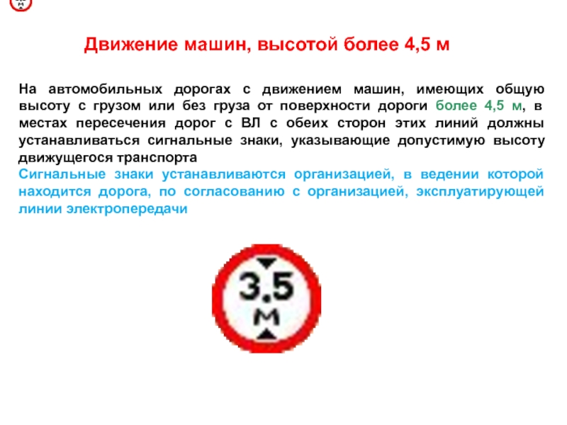 имеющих общую высоту с грузом или без груза от поверхности дороги более 4,5 м, в местах пересечения дорог с ВЛ с обеих сторон этих линий должны устанавливаться сигнальные знаки, указывающие допустимую высоту движущегося транспорта