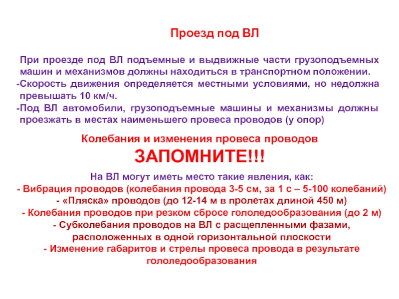 Под ВЛ автомобили, грузоподъемные машины и механизмы должны проезжать в местах наименьшего провеса проводов (у опор)