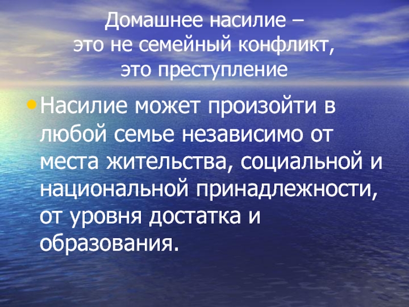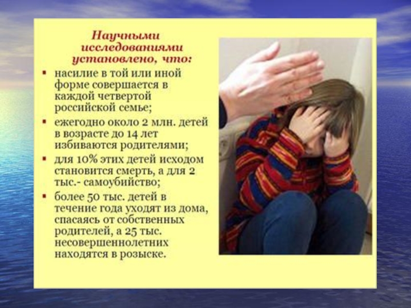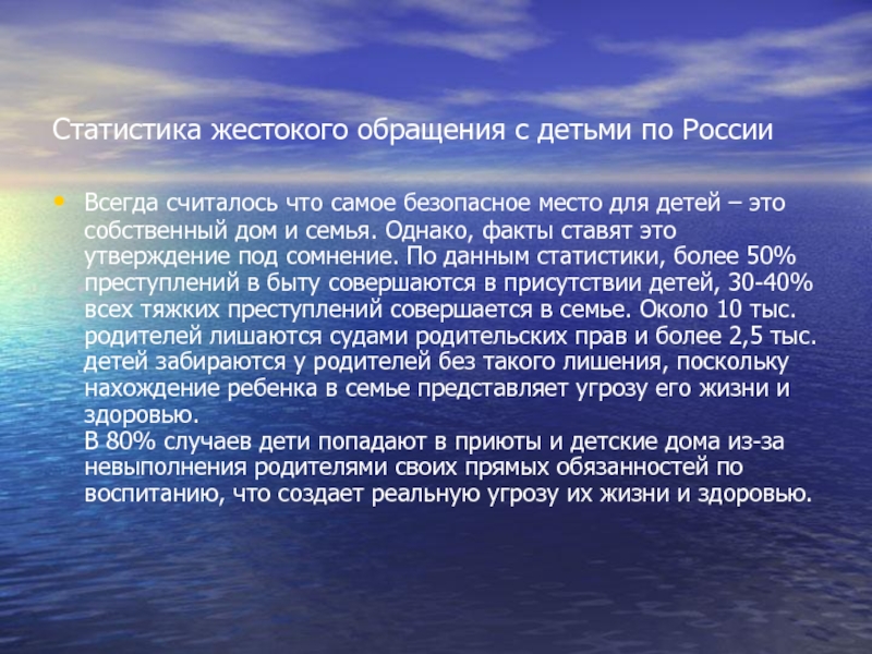 дом и семья. Однако, факты ставят это утверждение под сомнение. По данным статистики, более 50% преступлений в быту совершаются в присутствии детей, 30-40% всех тяжких преступлений совершается в семье. Около 10 тыс. родителей лишаются судами родительских прав и более 2,5 тыс. детей забираются у родителей без такого лишения, поскольку нахождение ребенка в семье представляет угрозу его жизни и здоровью.