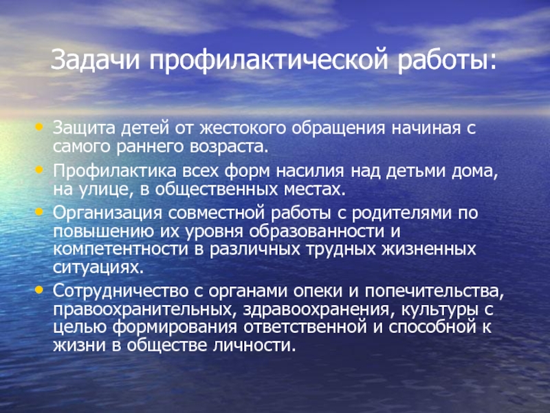 Профилактика всех форм насилия над детьми дома, на улице, в общественных местах.