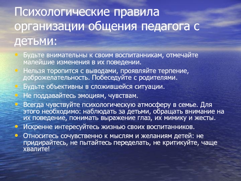 Слайд 10Психологические правила организации общения педагога с детьми: