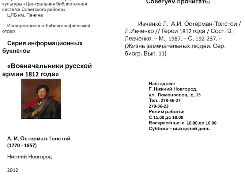 Ивченко Л. А.И. Остерман-Толстой / Л.Ивченко // Герои 1812 года / Сост. В. Левченко. – М., 1987. – С. 192-237. – (Жизнь замечательных людей. Сер. биогр. Вып. 11)