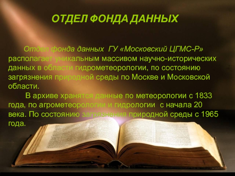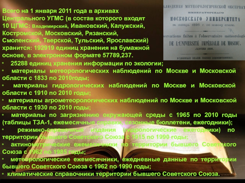 ∙ материалы метеорологических наблюдений по Москве и Московской области с 1833 по 2010годы;