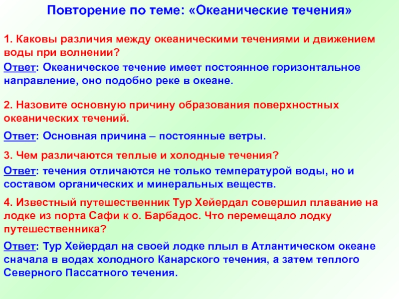 4. Известный путешественник Тур Хейердал совершил плавание на лодке из порта Сафи к о. Барбадос. Что перемещало лодку путешественника?
