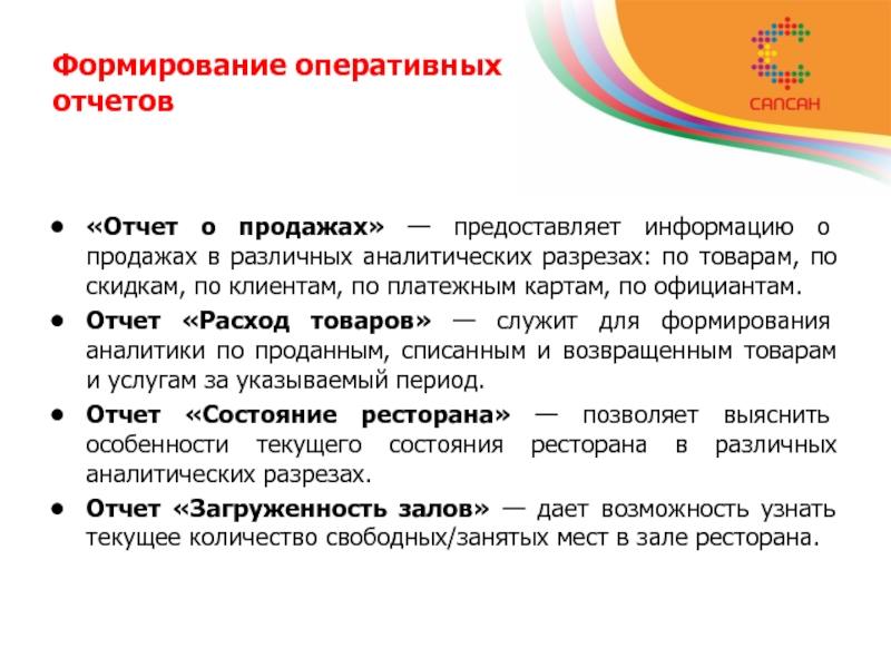 различных аналитических разрезах: по товарам, по скидкам, по клиентам, по платежным картам, по официантам.