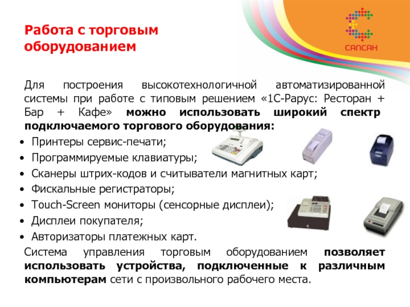 типовым решением «1С-Рарус: Ресторан + Бар + Кафе» можно использовать широкий спектр подключаемого торгового оборудования: