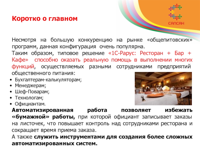 Таким образом, типовое решение «1С-Рарус: Ресторан + Бар + Кафе» способно оказать реальную помощь в выполнении многих функций, осуществляемых разными сотрудниками предприятий общественного питания: