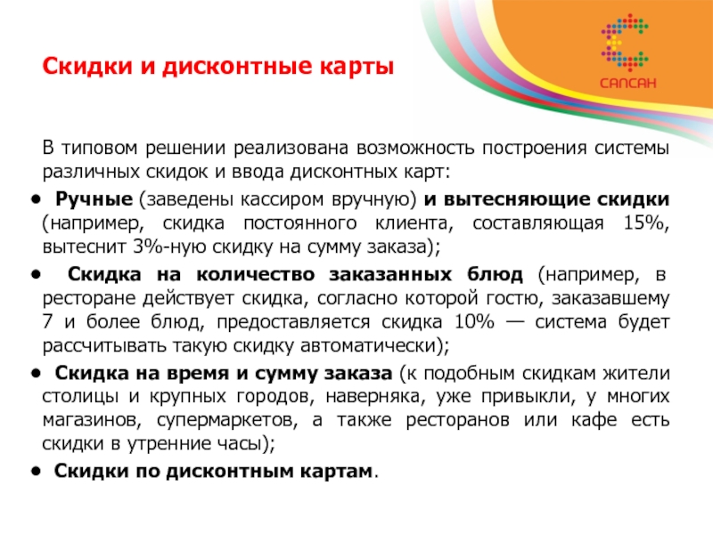 Ручные (заведены кассиром вручную) и вытесняющие скидки (например, скидка постоянного клиента, составляющая 15%, вытеснит 3%-ную скидку на сумму заказа);