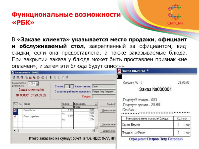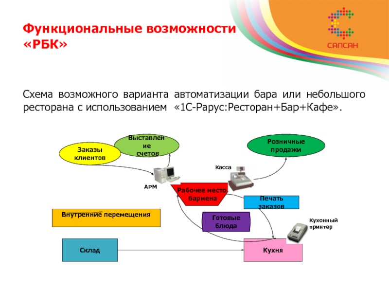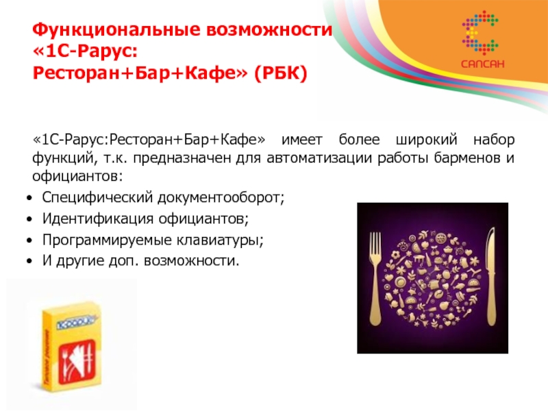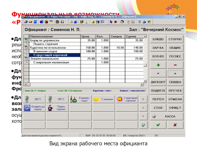 Слайд 10Функциональные возможности «1С-Рарус: Ресторан+Бар+Кафе» (РБК)