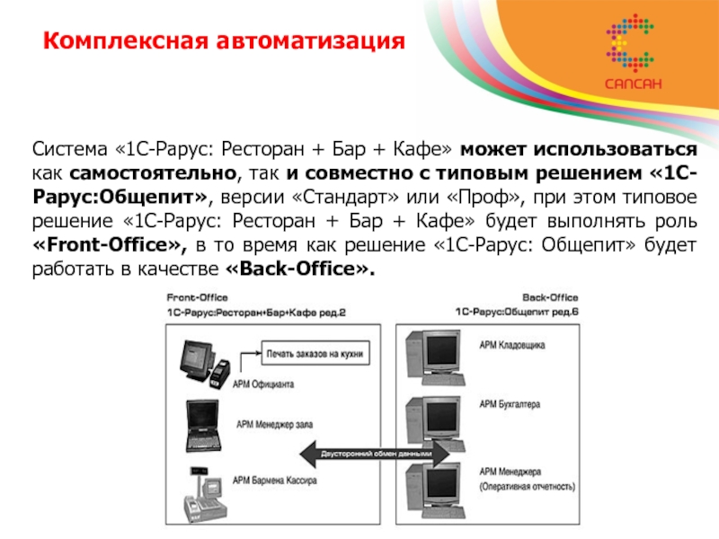 самостоятельно, так и совместно с типовым решением «1С-Рарус:Общепит», версии «Стандарт» или «Проф», при этом типовое решение «1С-Рарус: Ресторан + Бар + Кафе» будет выполнять роль «Front-Office», в то время как решение «1С-Рарус: Общепит» будет работать в качестве «Back-Office».