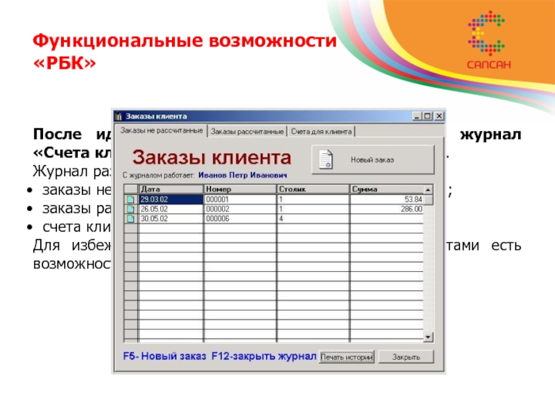 После идентификации официанта открывается журнал «Счета клиента» с уже