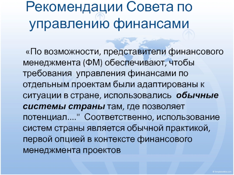чтобы требования управления финансами по отдельным проектам были адаптированы к ситуации в стране, использовались обычные системы страны там, где позволяет потенциал...." Соответственно, использование систем страны является обычной практикой, первой опцией в контексте финансового менеджмента проектов