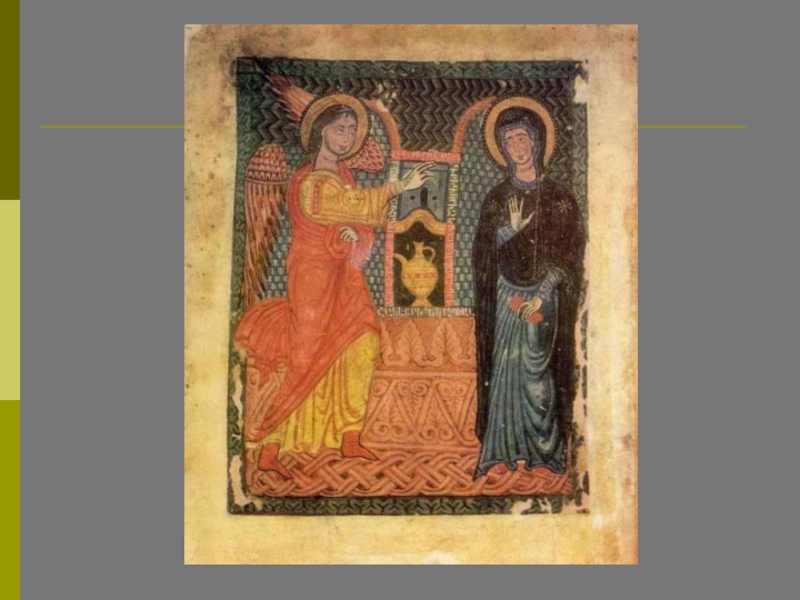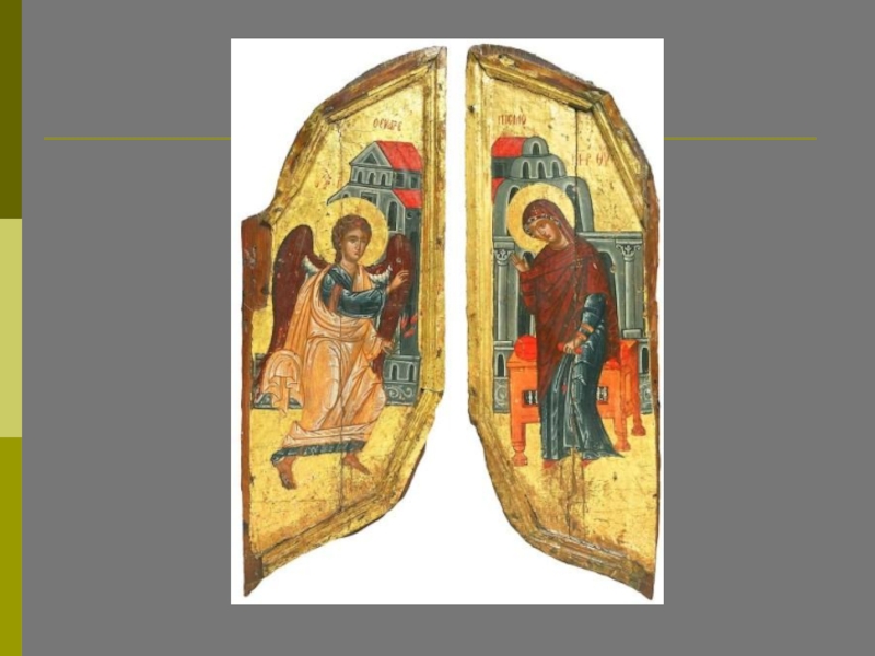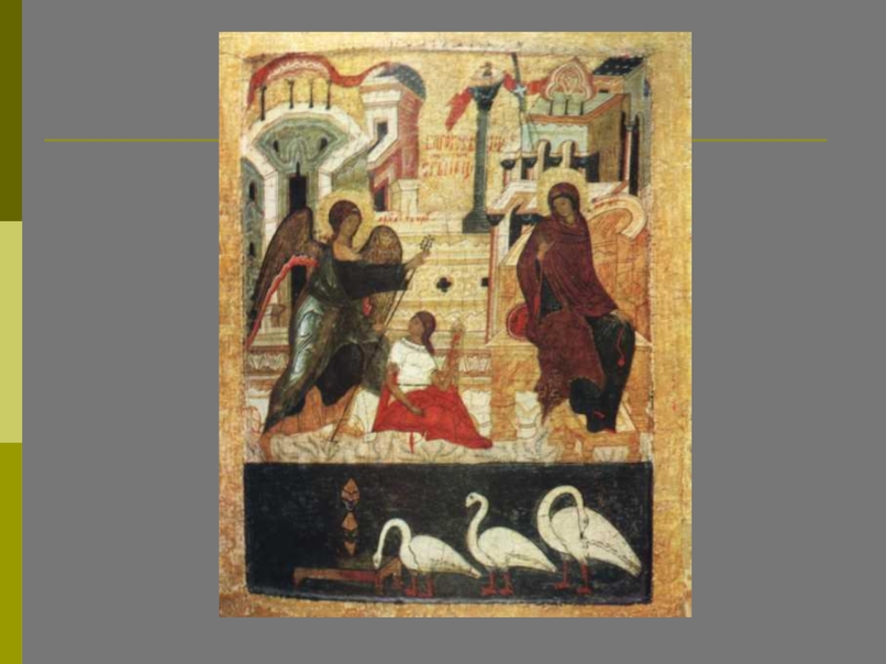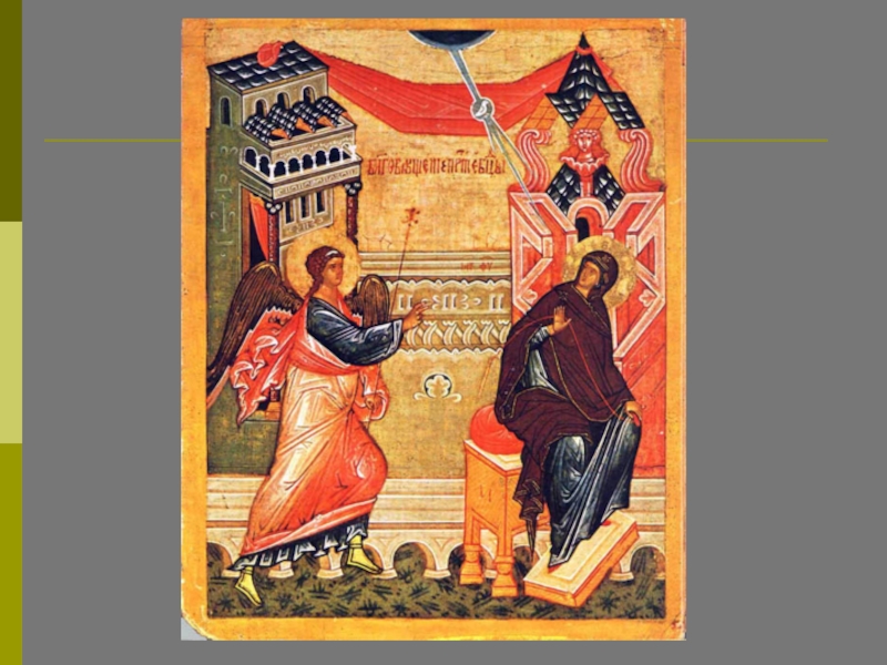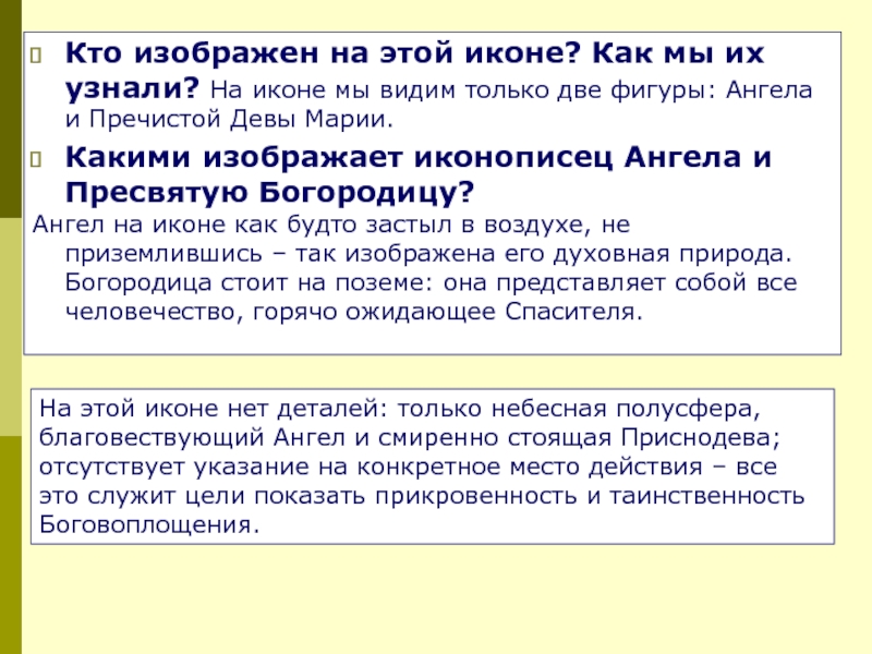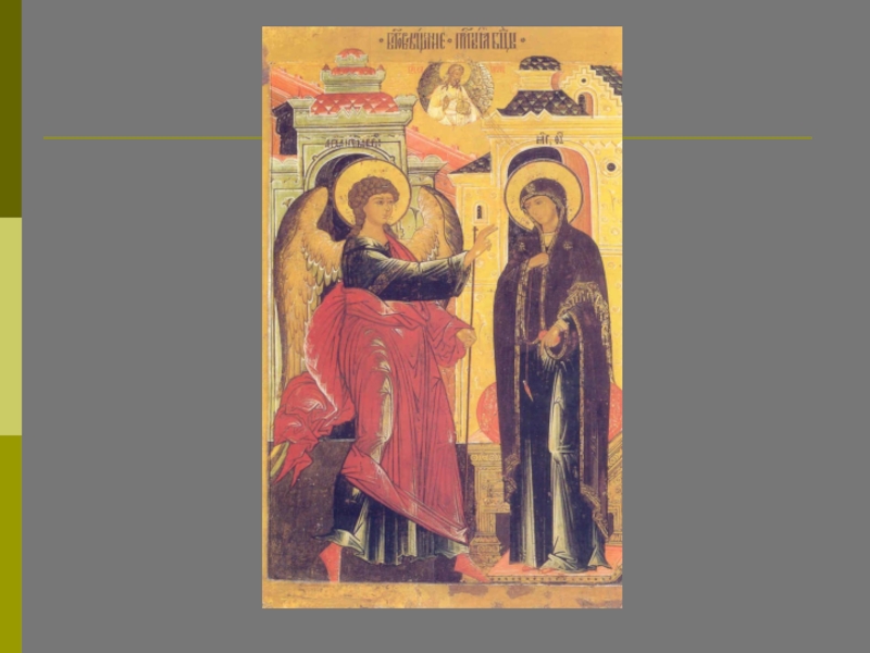 На этой иконе нет деталей: только небесная полусфера, благовествующий Ангел и смиренно стоящая Приснодева; отсутствует указание на конкретное место действия – все это служит цели показать прикровенность и таинственность Боговоплощения.