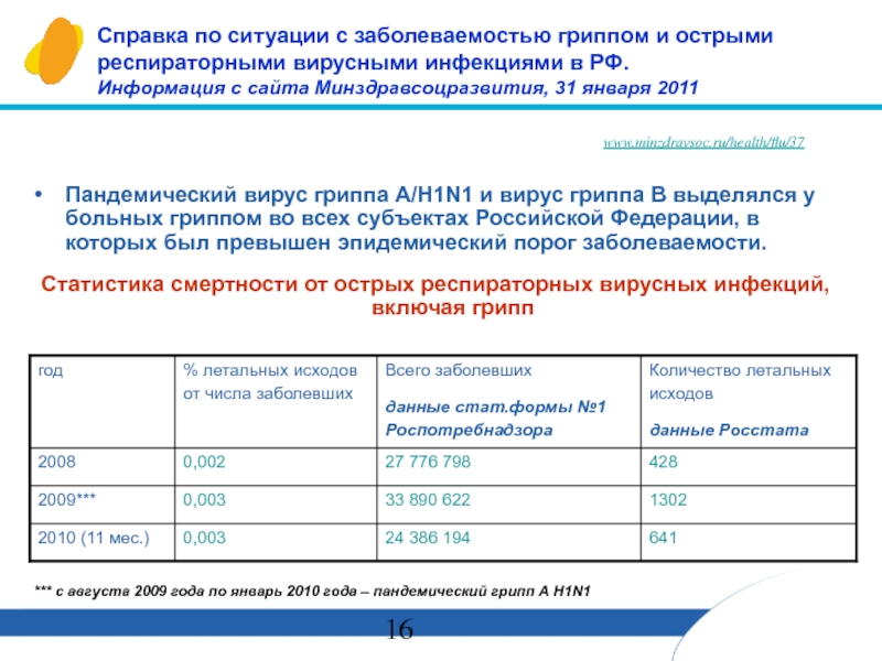 *** с августа 2009 года по январь 2010 года – пандемический грипп А Н1N1