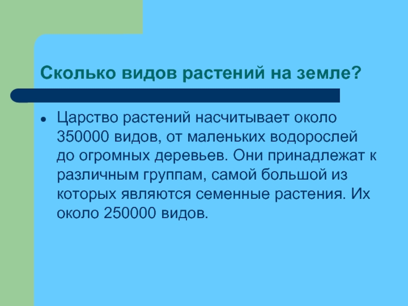 от маленьких водорослей до огромных деревьев. Они принадлежат к различным группам, самой большой из которых являются семенные растения. Их около 250000 видов.