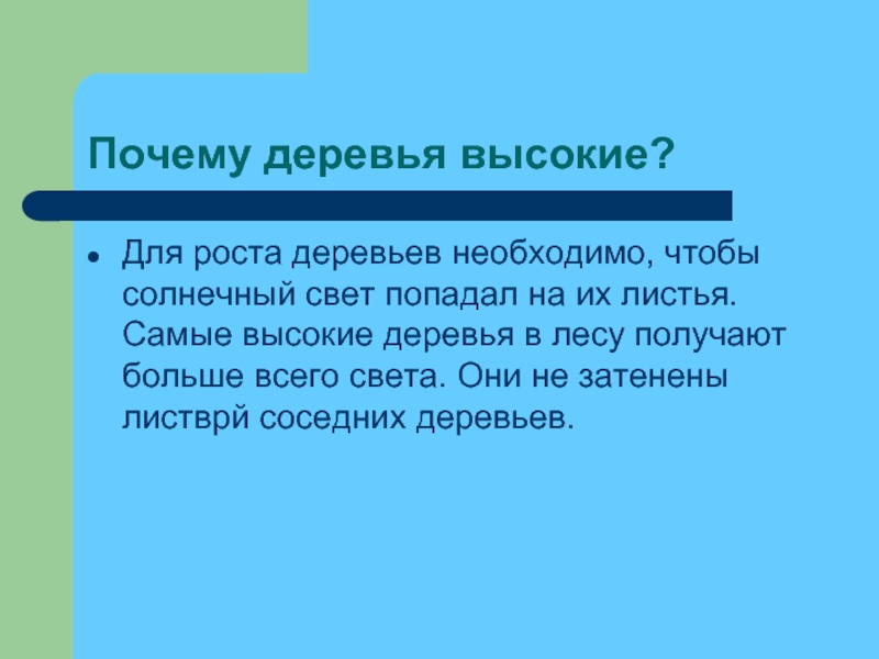 их листья. Самые высокие деревья в лесу получают больше всего света. Они не затенены листврй соседних деревьев.