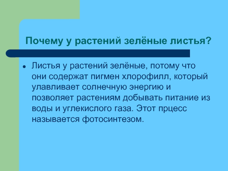 они содержат пигмен хлорофилл, который улавливает солнечную энергию и позволяет растениям добывать питание из воды и углекислого газа. Этот прцесс называется фотосинтезом.