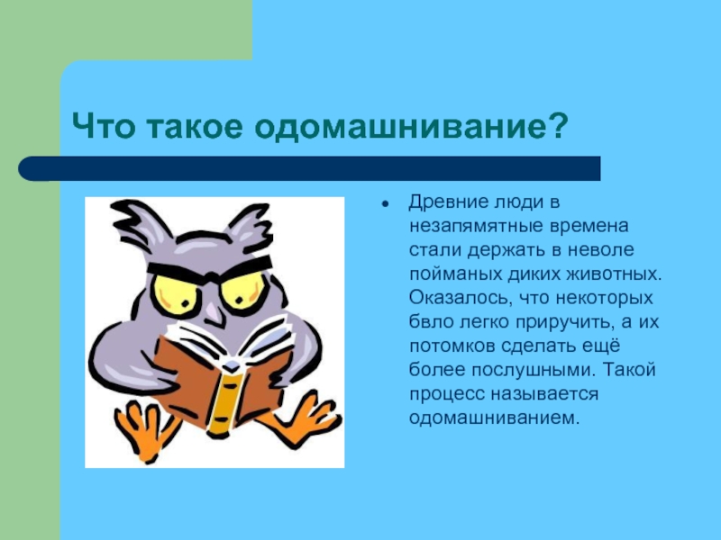 пойманых диких животных. Оказалось, что некоторых бвло легко приручить, а их потомков сделать ещё более послушными. Такой процесс называется одомашниванием.