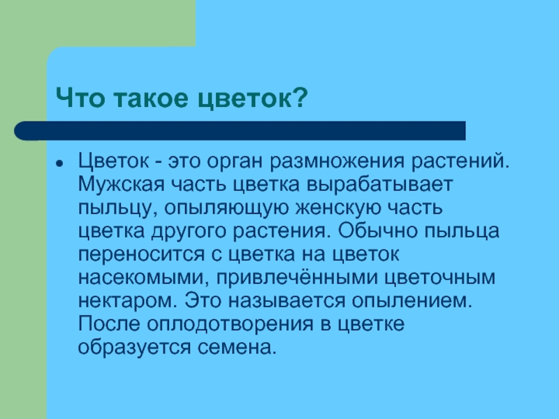 вырабатывает пыльцу, опыляющую женскую часть цветка другого растения. Обычно пыльца переносится с цветка на цветок насекомыми, привлечёнными цветочным нектаром. Это называется опылением. После оплодотворения в цветке образуется семена.