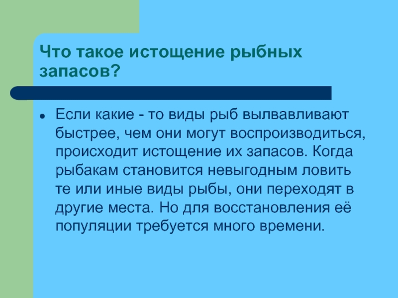 вылвавливают быстрее, чем они могут воспроизводиться, происходит истощение их запасов. Когда рыбакам становится невыгодным ловить те или иные виды рыбы, они переходят в другие места. Но для восстановления её популяции требуется много времени.
