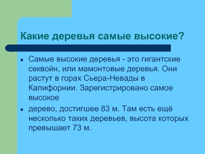мамонтовые деревья. Они растут в горах Сьера-Невады в Калифорнии. Зарегистрировано самое высокое