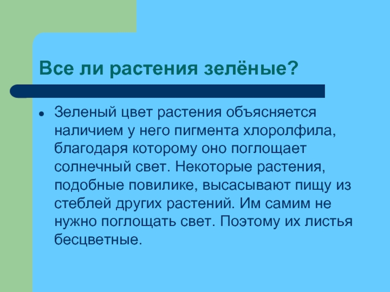 пигмента хлоролфила, благодаря которому оно поглощает солнечный свет. Некоторые растения, подобные повилике, высасывают пищу из стеблей других растений. Им самим не нужно поглощать свет. Поэтому их листья бесцветные.