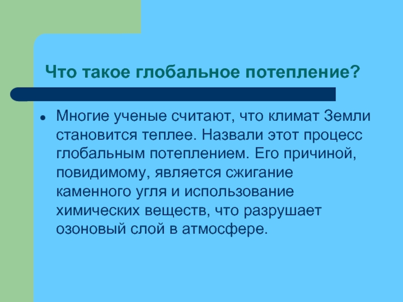 теплее. Назвали этот процесс глобальным потеплением. Его причиной, повидимому, является сжигание каменного угля и использование химических веществ, что разрушает озоновый слой в атмосфере.