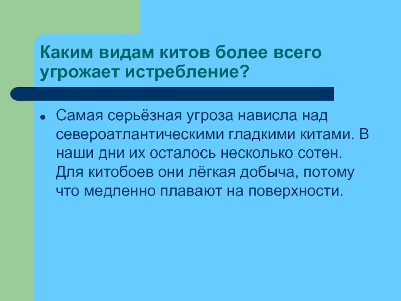 Слайд 41Каким видам китов более всего угрожает истребление?