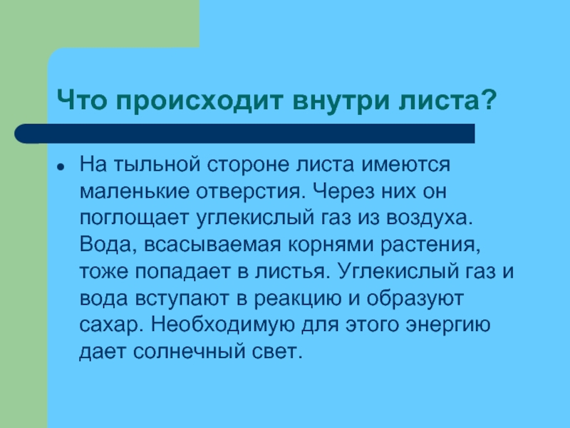 Через них он поглощает углекислый газ из воздуха. Вода, всасываемая корнями растения, тоже попадает в листья. Углекислый газ и вода вступают в реакцию и образуют сахар. Необходимую для этого энергию дает солнечный свет.