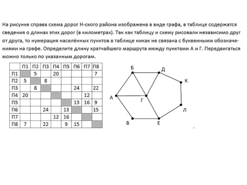 в таблице содержатся сведения о длинах этих дорог (в километрах). Так как таблицу и схему рисовали независимо друг от друга, то нумерация населенных пунктов в таблице никак не связана с буквенными обозначениями на графе. Определите, какова длина дороги из пункта Д в пункт К. В ответе запишите целое число — так, как оно указано в таблице.