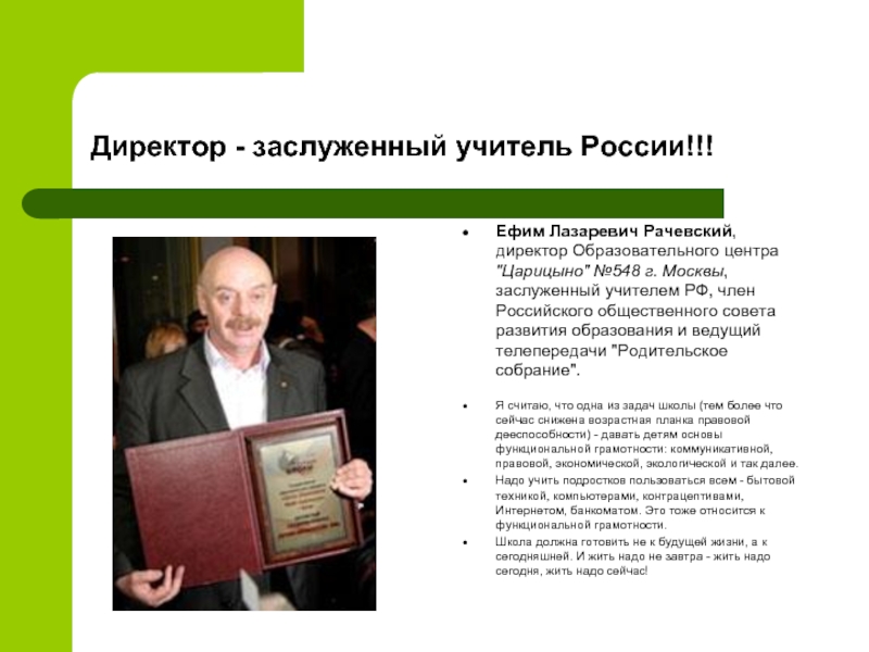 Я считаю, что одна из задач школы (тем более что сейчас снижена возрастная планка правовой дееспособности) - давать детям основы функциональной грамотности: коммуникативной, правовой, экономической, экологической и так далее.
