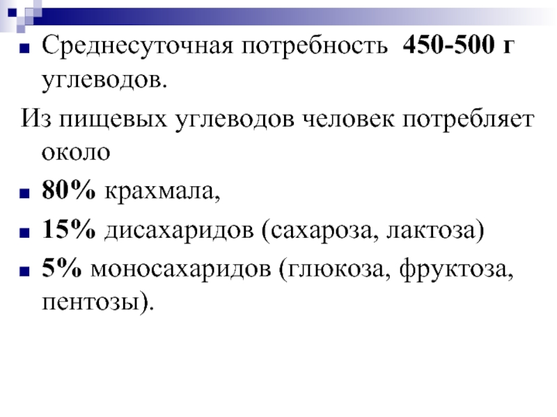 Слайд 3Среднесуточная потребность 450-500 г углеводов.