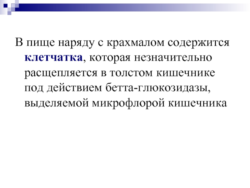 Слайд 7В пище наряду с крахмалом содержится клетчатка, которая незначительно расщепляется в