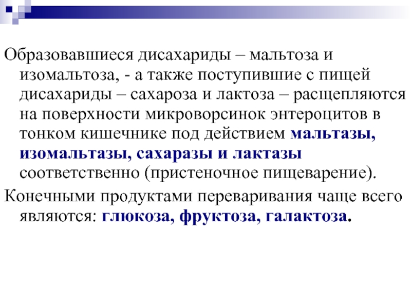 пищей дисахариды – сахароза и лактоза – расщепляются на поверхности микроворсинок энтероцитов в тонком кишечнике под действием мальтазы, изомальтазы, сахаразы и лактазы соответственно (пристеночное пищеварение).