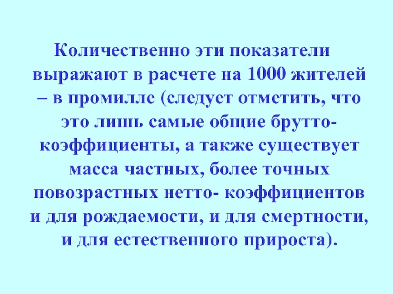 промилле (следует отметить, что это лишь самые общие брутто- коэффициенты, а также существует масса частных, более точных повозрастных нетто- коэффициентов и для рождаемости, и для смертности, и для естественного прироста).