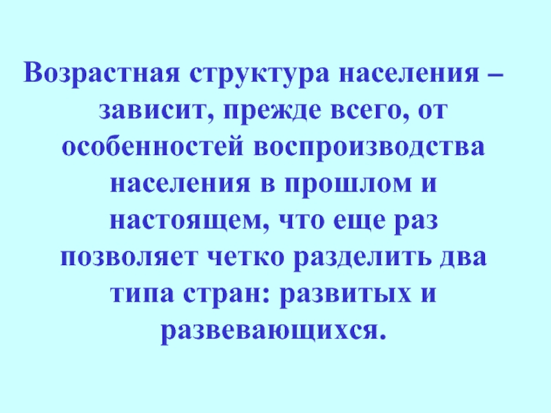 Слайд 136Возрастная структура населения – зависит, прежде всего, от особенностей воспроизводства населения