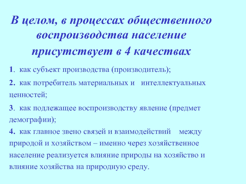 Слайд 12В целом, в процессах общественного воспроизводства население присутствует в 4 качествах