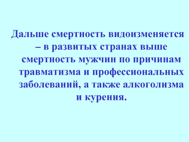 Слайд 130Дальше смертность видоизменяется – в развитых странах выше смертность мужчин по