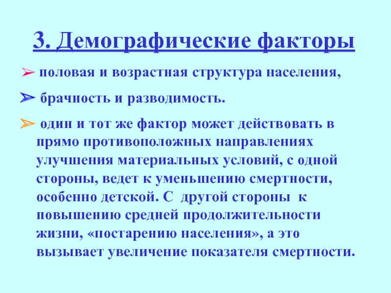один и тот же фактор может действовать в прямо противоположных направлениях улучшения материальных условий, с одной стороны, ведет к уменьшению смертности, особенно детской. С другой стороны к повышению средней продолжительности жизни, «постарению населения», а это вызывает увеличение показателя смертности.