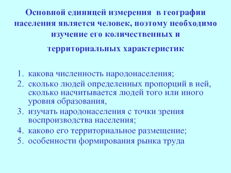 Слайд 13Основной единицей измерения в географии населения является человек, поэтому необходимо изучение