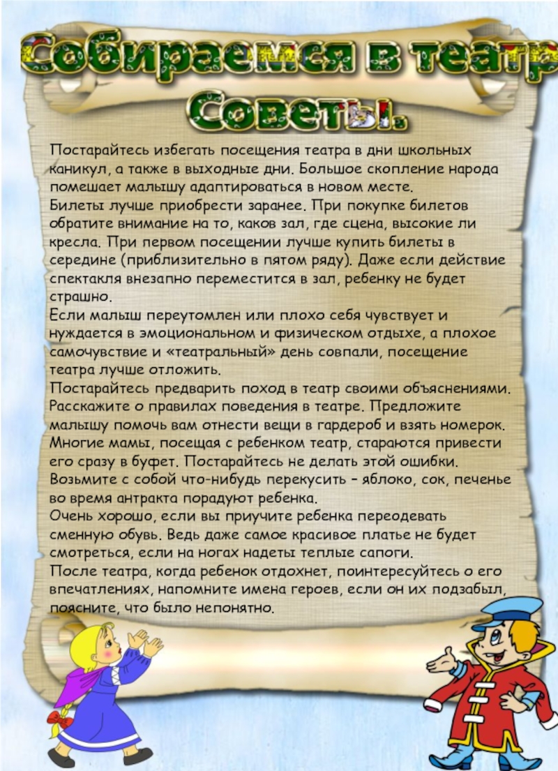 знакомых, просмотр сайтов с репертуаром, фотографиями и отзывами, анонс (в прессе, на телевидении, в Интернете), афиши. При выборе театра для детей-дошкольников лучше отдать предпочтение специализированному детскому театру, несмотря на то, что некоторые «взрослые» театры ставят спектакли для детей. В них времяпрепровождения до начала представления чаще всего продумано до мелочей – детей встречают у входа клоуны, сказочные персонажи, с ними играют, устаивают конкурсы и т.д. Малыш сразу попадает в волшебную атмосферу театрального мира. Желательно прийти в театр заранее, чтобы малыш смог привыкнуть к новой обстановке и шум, яркие наряды его не испугали….