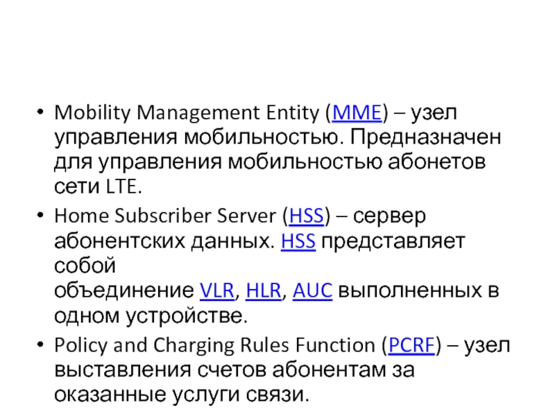 Mobility Management Entity (MME) – узел управления мобильностью. Предназначен для управления