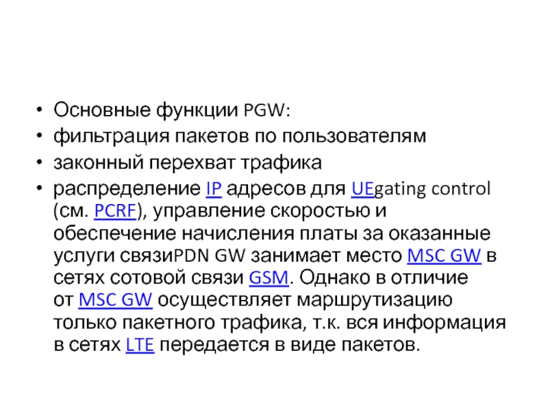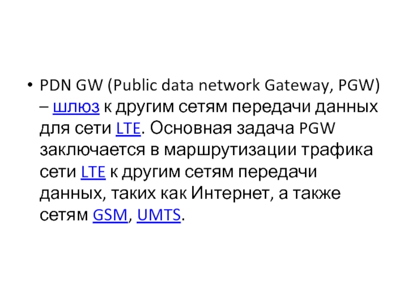 данных для сети LTE. Основная задача PGW заключается в маршрутизации трафика сети LTE к другим сетям передачи данных, таких как Интернет, а также сетям GSM, UMTS.
