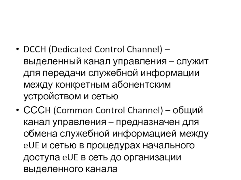 СССH (Common Control Channel) – общий канал управления – предназначен для обмена служебной информацией между eUE и сетью в процедурах начального доступа eUE в сеть до организации выделенного канала