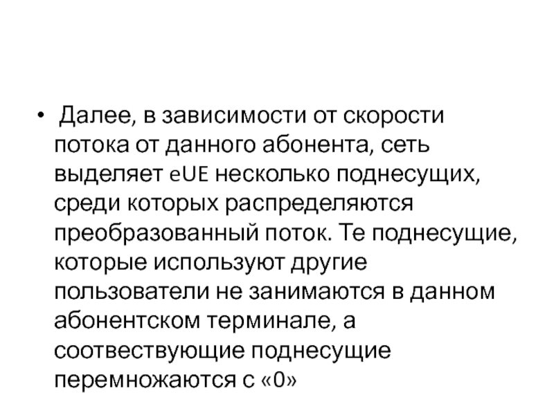eUE несколько поднесущих, среди которых распределяются преобразованный поток. Те поднесущие, которые используют другие пользователи не занимаются в данном абонентском терминале, а соотвествующие поднесущие перемножаются с «0»