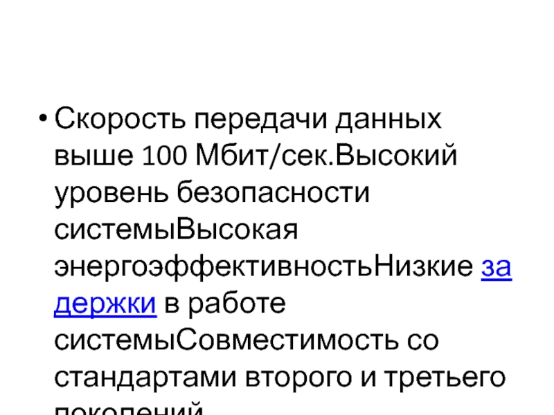 Скорость передачи данных выше 100 Мбит/сек.Высокий уровень безопасности системыВысокая энергоэффективностьНизкие задержки в работе