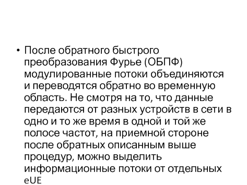 обратно во временную область. Не смотря на то, что данные передаются от разных устройств в сети в одно и то же время в одной и той же полосе частот, на приемной стороне после обратных описанным выше процедур, можно выделить информационные потоки от отдельных eUE
