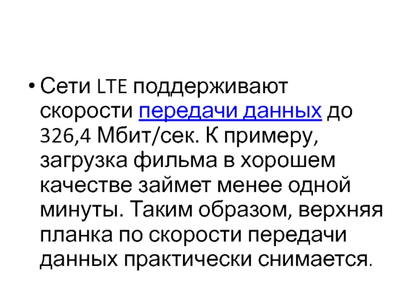 Сети LTE поддерживают скорости передачи данных до 326,4 Мбит/сек. К примеру, загрузка фильма