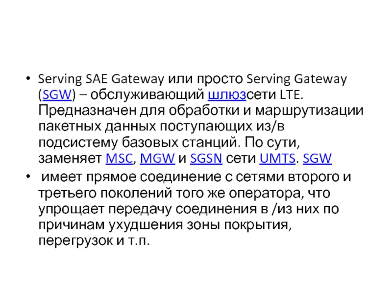 Serving SAE Gateway или просто Serving Gateway (SGW) – обслуживающий шлюзсети LTE.